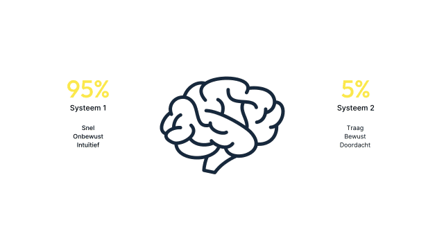 De meeste van je klanten maken keuzes op basis van systeem 1. Denk aan de snelle aankoop van een blikje cola of een impulsaankoop online. Pas als je te maken hebt met grote, belangrijke aankopen zoals een auto komt systeem 2 in actie en moet je rationele, overtuigende argumenten aanleveren.